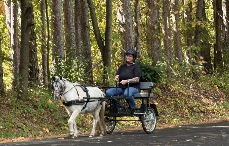 The carriage driving program will be run in the indoor arena, outdoor arena, and on the 1 mile+ long Saddle Safari Sensory Trail at Equest Center. This specially designed trail has many avenues to choose from that are enhanced with beautiful foliage, creeks, ponds, fields and one-of-a kind sensory stations.